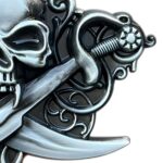 Evoking the rebellious spirit of buccaneers, this skull belt buckle features a pirate skull, framed by swords and embellishments that seem to narrate tales of oceans and conquests. It stands as a tribute to courage and freedom, crafted for those who carry the spirit of a modern-day navigator. The intricacy of details and the metallic sheen make this buckle a symbol of strength and boldness, a prime choice for asserting a strong identity.