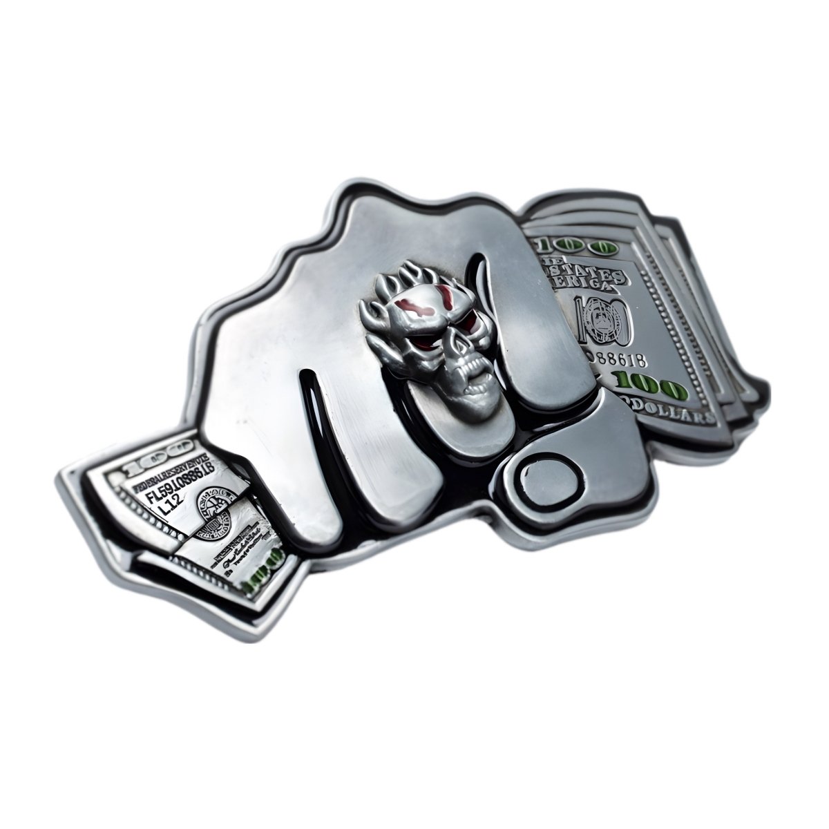 In a world where style reflects one's identity, this belt buckle emerges as the ultimate emblem of power and prosperity. Crafted for the ambitious, its design features a clenched fist, tightly holding a stack of bills, signifying a presence that commands attention. The skull on the fist is more than a mere aesthetic detail; it represents a spirit of domination and success, dedicated to those who dare to assert themselves in pursuit of their highest aspirations.