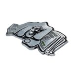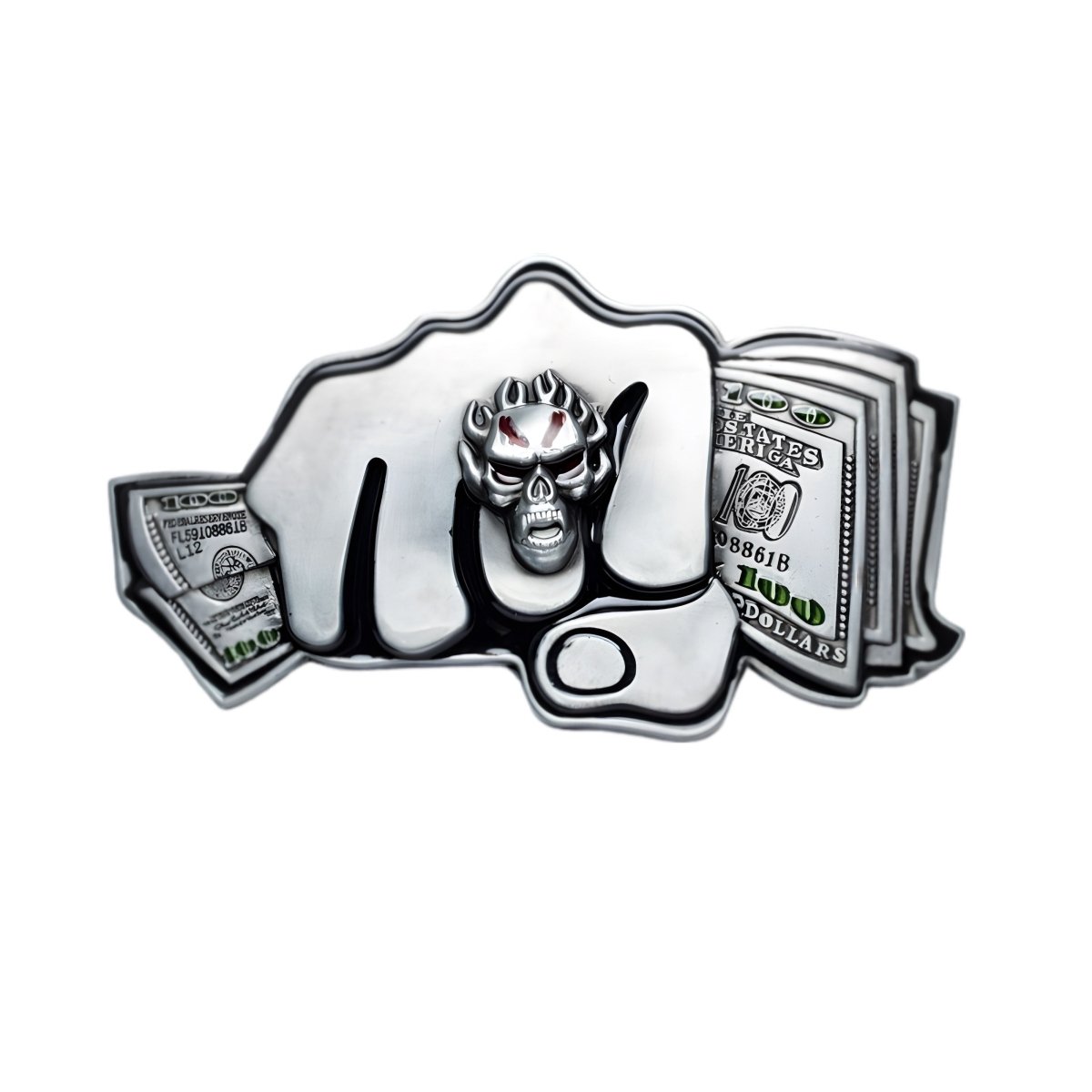 In a world where style reflects one's identity, this belt buckle emerges as the ultimate emblem of power and prosperity. Crafted for the ambitious, its design features a clenched fist, tightly holding a stack of bills, signifying a presence that commands attention. The skull on the fist is more than a mere aesthetic detail; it represents a spirit of domination and success, dedicated to those who dare to assert themselves in pursuit of their highest aspirations.