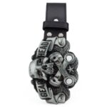 The rounded clip buckle, crafted from a high-quality silver metallic alloy, adds a touch of class to the piece. The skull motif adorning the buckle pays homage to the daring spirit emblematic of punk culture. The Cromwell model allows you to assert your style with confidence. Whether paired with ripped jeans and a graphic tee or layered over a leather jacket, this skull belt is the perfect complement for those looking to forge a bold and impactful style.