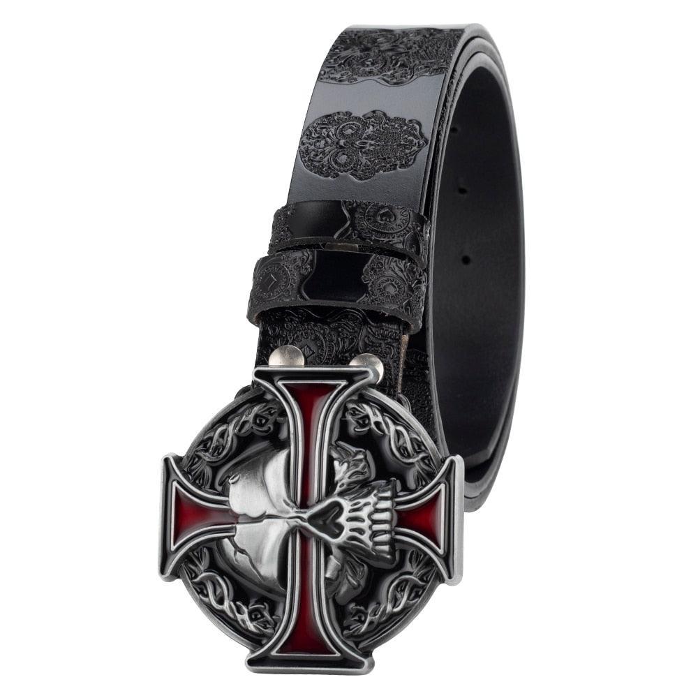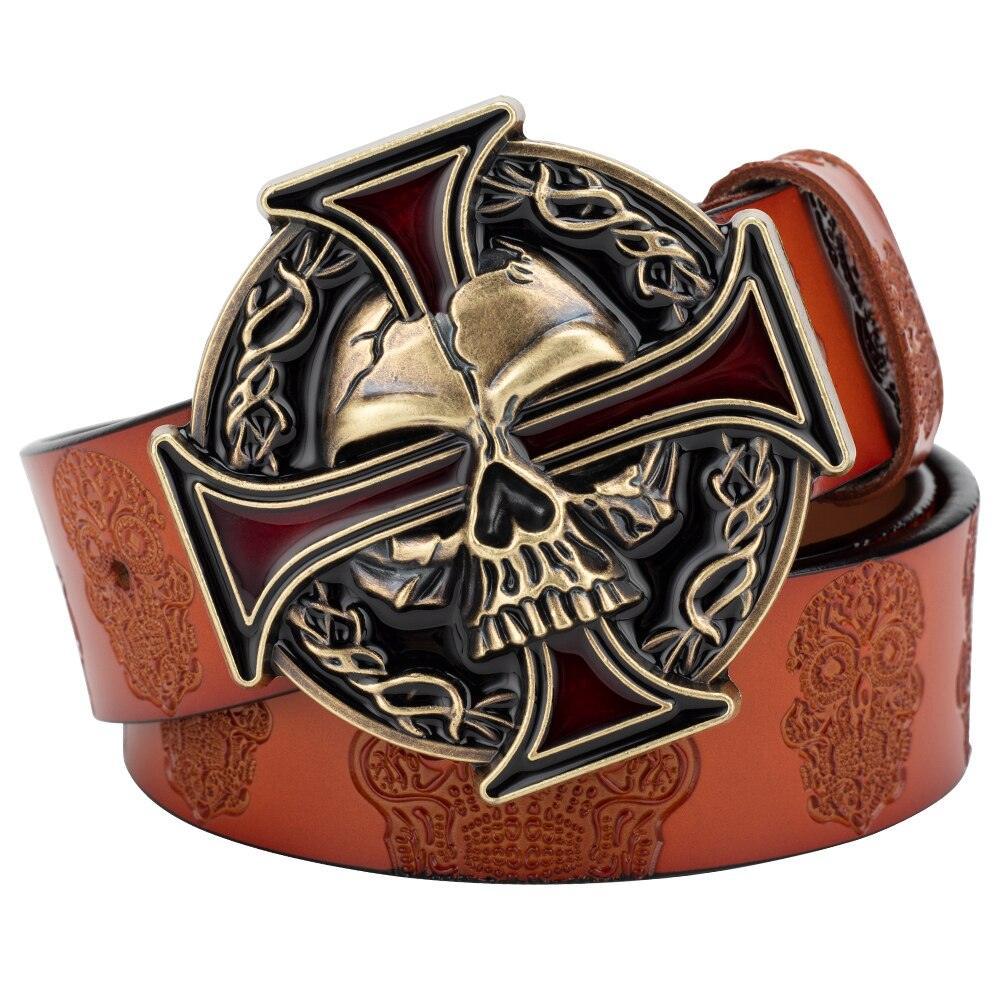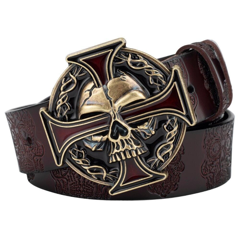 The Magnus model embodies the essence of punk style with a skull belt that is sure to turn heads. It's the perfect accessory to highlight your fashion sense. The textured strap is crafted from high-quality split leather, providing a unique look that enhances its aesthetic appeal. Measuring 3.8 cm in width and 3 mm in thickness, it fits seamlessly with your silhouette, adding a distinctive touch to any outfit.