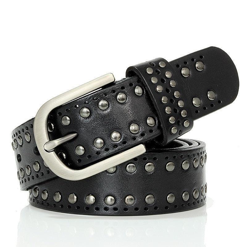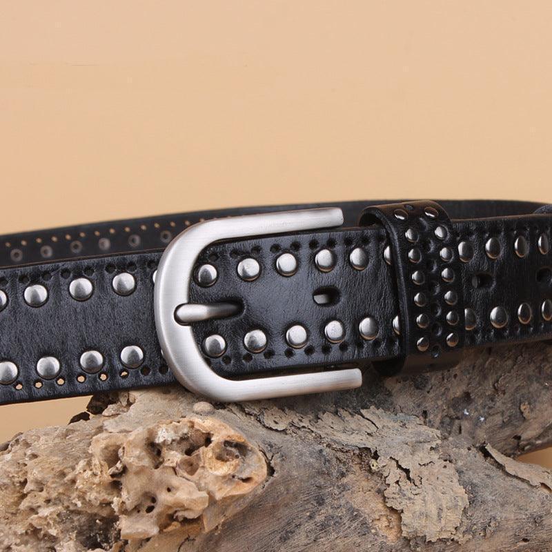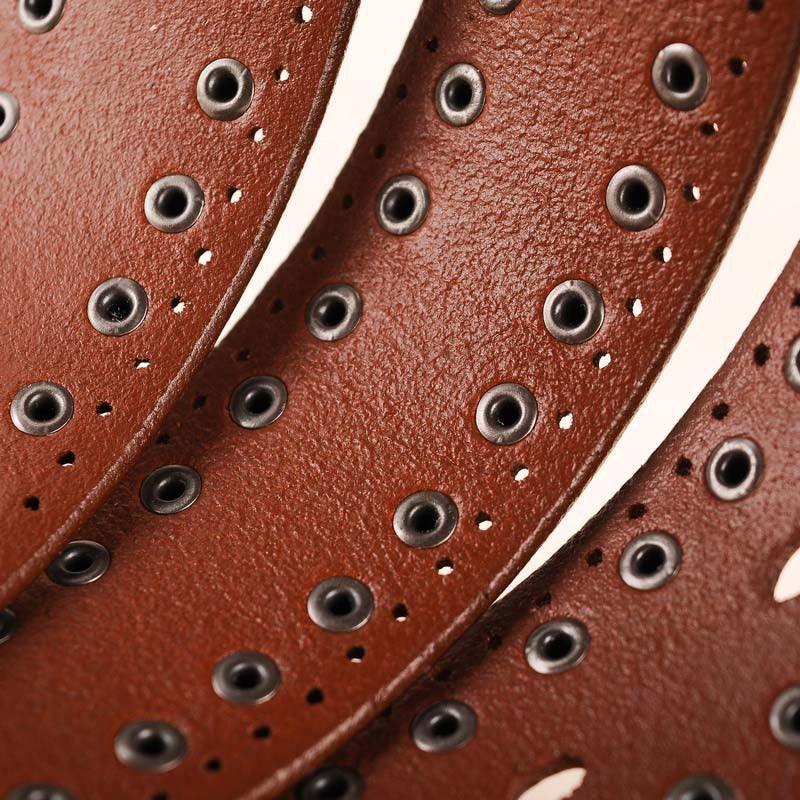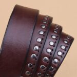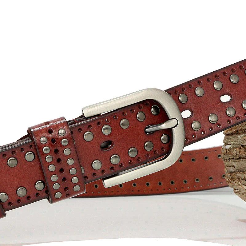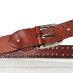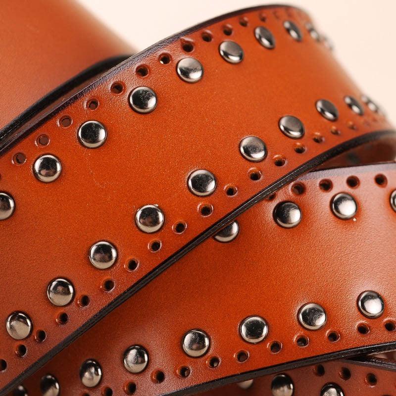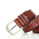 The Neia studded belt epitomises understated elegance. Crafted from cowhide leather, it represents the ultimate in style, blending tradition with contemporary flair. Delicate perforations, enhanced with round studs, demonstrate a meticulous attention to detail, making each piece a true fashion gem. Its rectangular buckle in silver-toned metal alloy adds a touch of subtle glamour, perfect for elevating a pair of jeans or completing a cardigan ensemble.