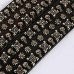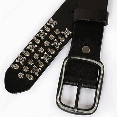 Pretty raised rivets in the shape of a skull and two types of flowers with the buckle held in place by a leather tie