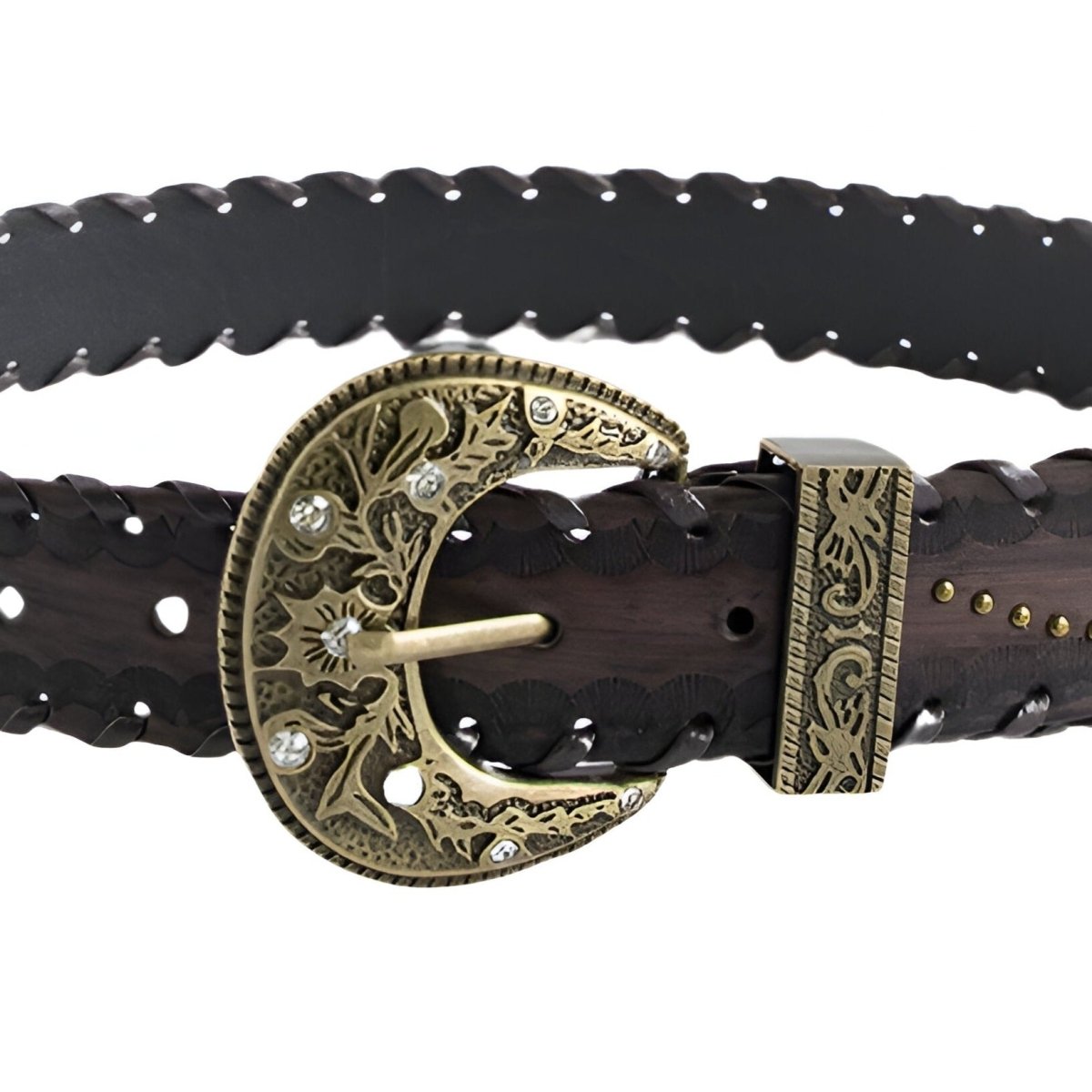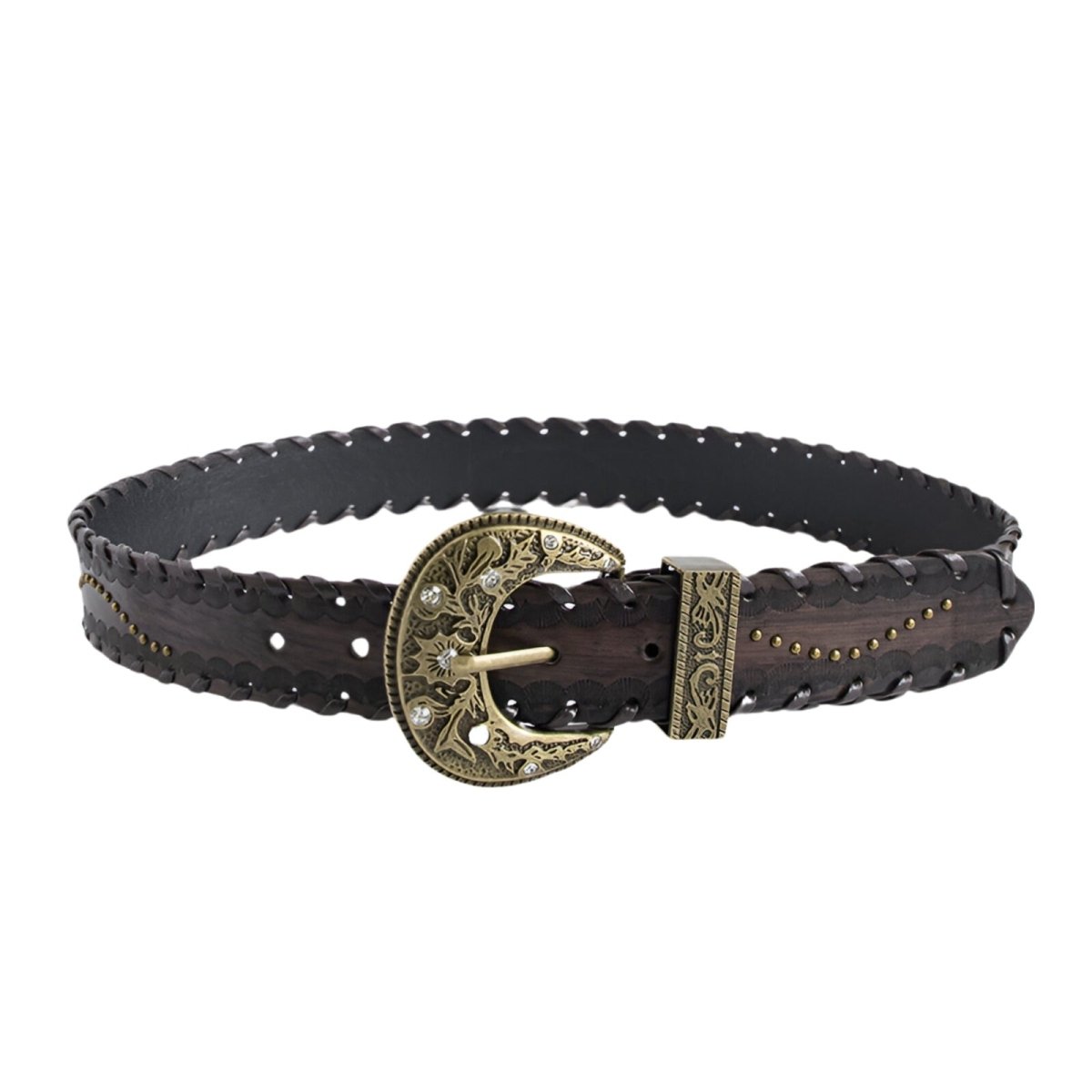 This studded belt is a true fashion statement for those looking to inject a wild spirit into their outfits. The distinctive buckle design, adorned with floral patterns and rhinestone bursts, blends Western authenticity with a touch of modernity. The decorated metallic loop accompanies the buckle to create a harmonious and captivating ensemble. The buckle's details are an ode to craftsmanship and attention to detail, ensuring it becomes the focal point of any outfit.