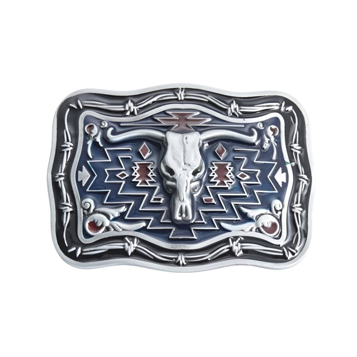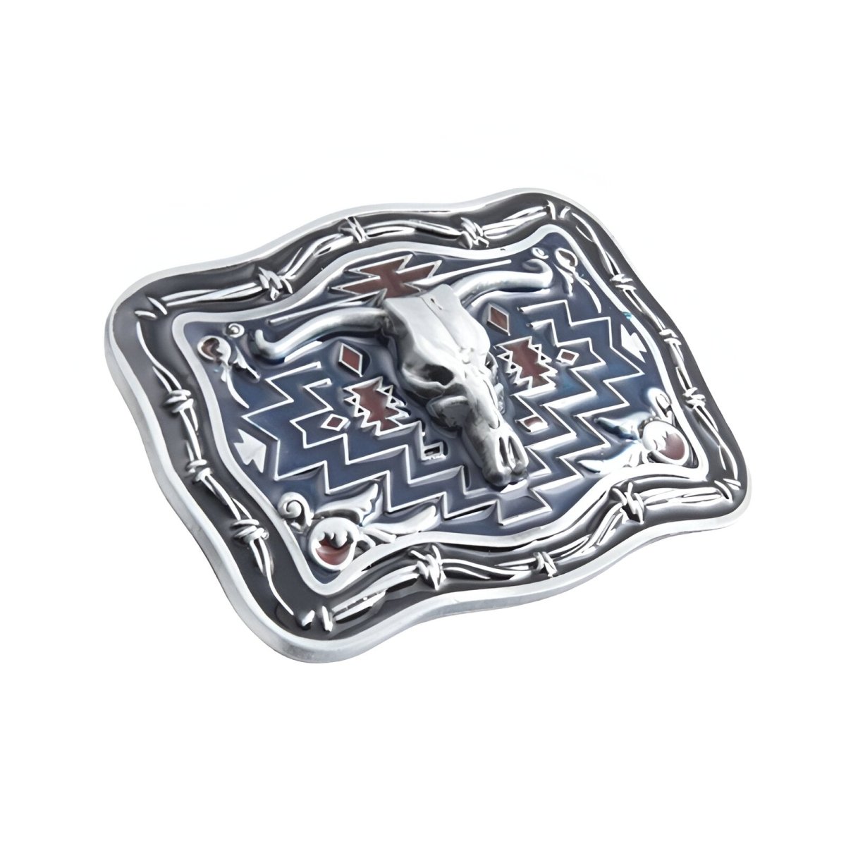 Channel the untamed spirit of the Wild West with this bold cowboy belt buckle, proudly featuring a bull skull. This accessory epitomizes quiet strength and unbounded freedom. Surrounded by a geometric pattern that mirrors the expansive horizons, this skull is not only a tribute to the wild outdoors, but also a centrepiece of personal expression. Each detail is meticulously crafted to reflect a resilient character and a flair for adventure.