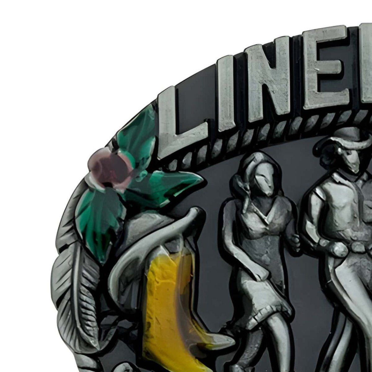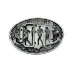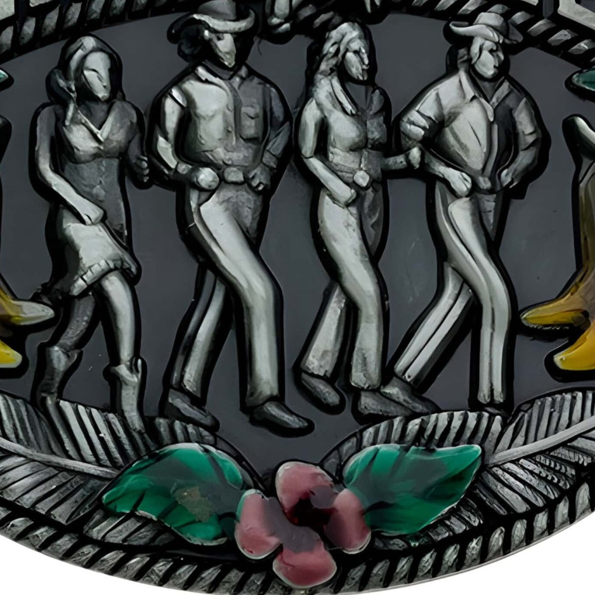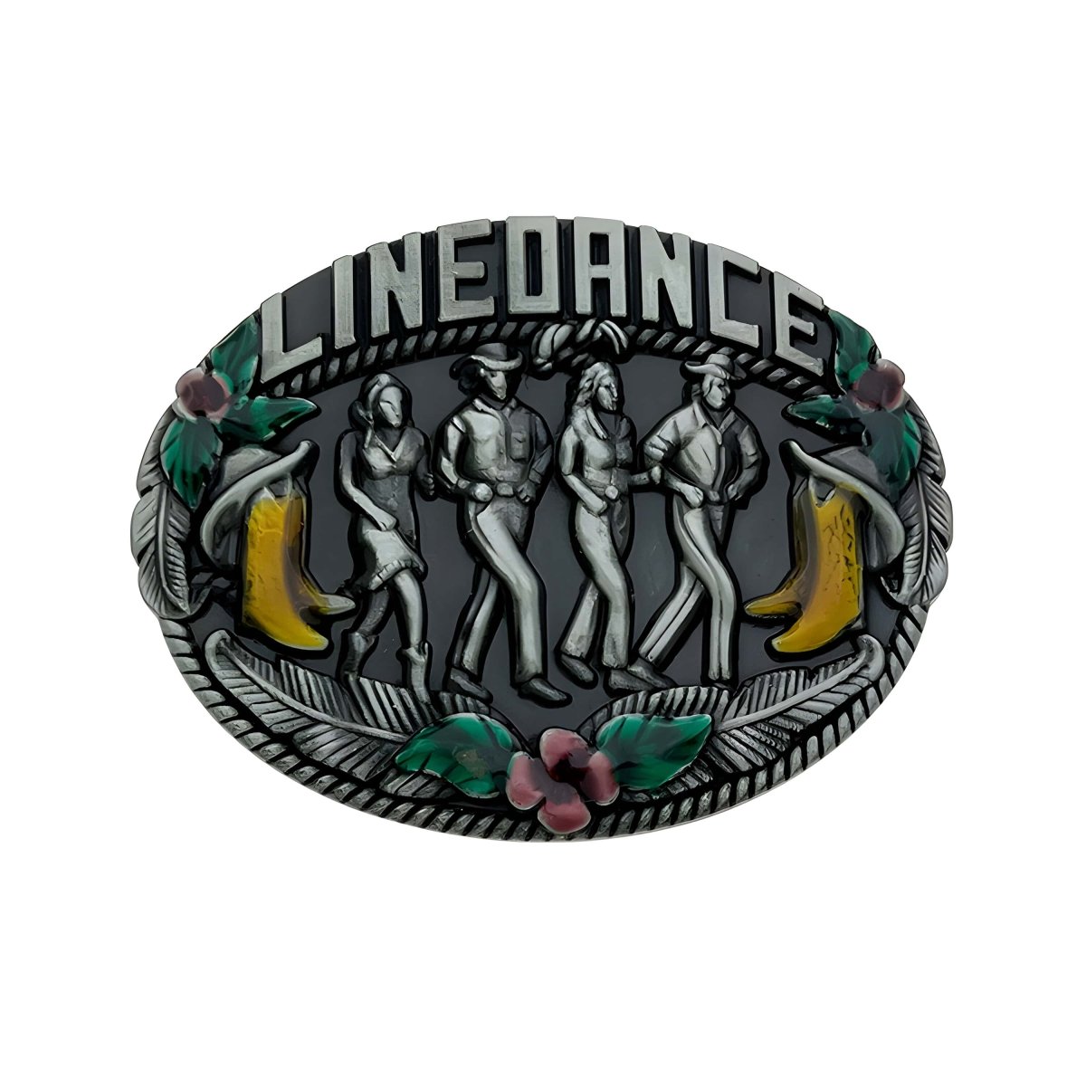 This belt buckle is a tribute to line dancing, capturing the essence of country dancing with a series of perfectly aligned dancer silhouettes. The embossed figures depict a lively scene, each movement and stance reflecting the infectious rhythm and camaraderie of this dance tradition. Framed by delicate floral patterns and colourful accents, the buckle evokes a sense of joy and belonging, making it an ideal accessory for those who live to the beat of music and dance.