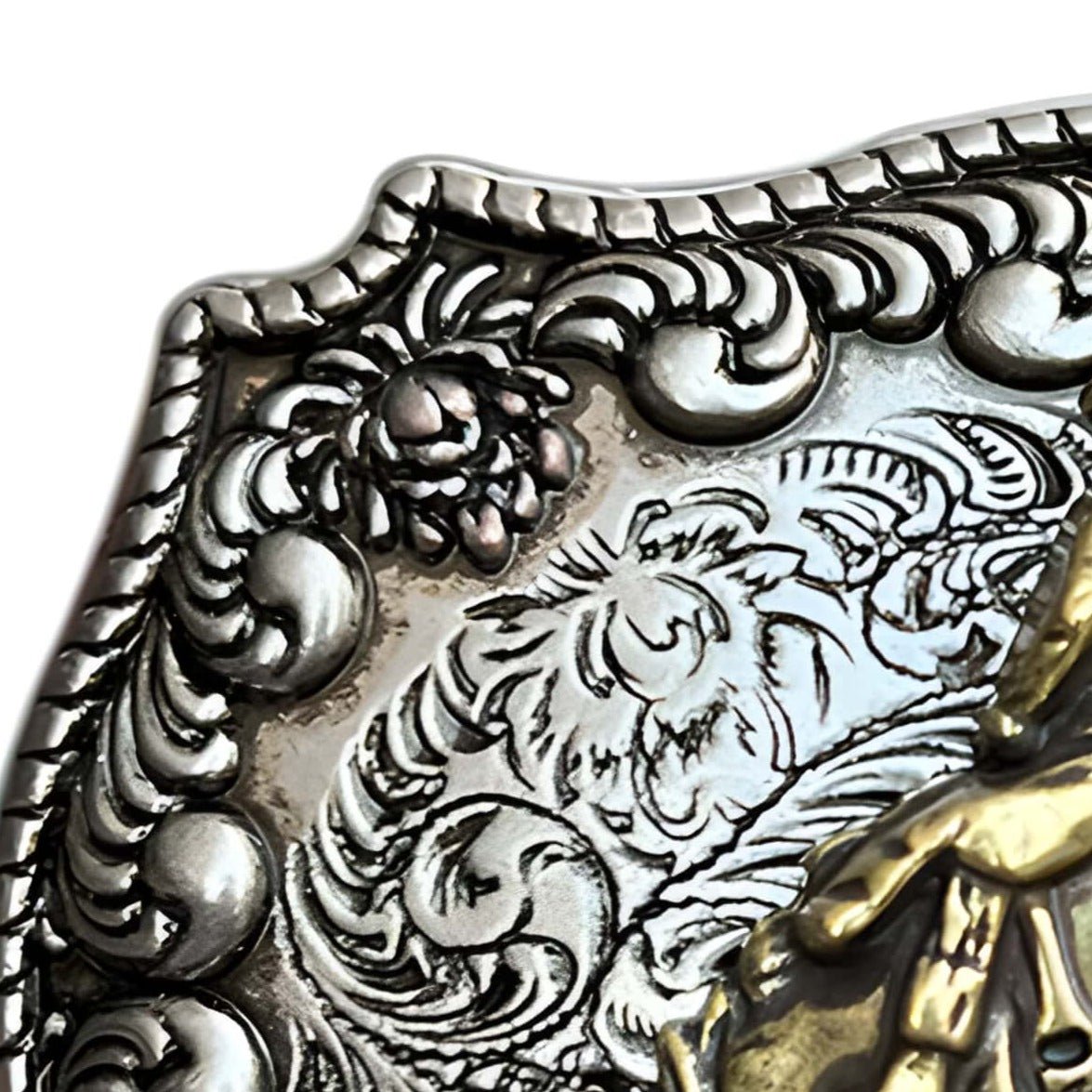Capturing the essence of the rodeo, this belt buckle is a vibrant celebration of the cowboy and his loyal steed, depicted in a moment of timeless action. Set against a backdrop of intricate scrolls and lush flowers, the dynamic duo is prominently featured in relief, conveying a sense of movement and energy. This accessory is not just a tribute to cowboy culture, but a statement piece that speaks to skill, bravery, and freedom.