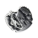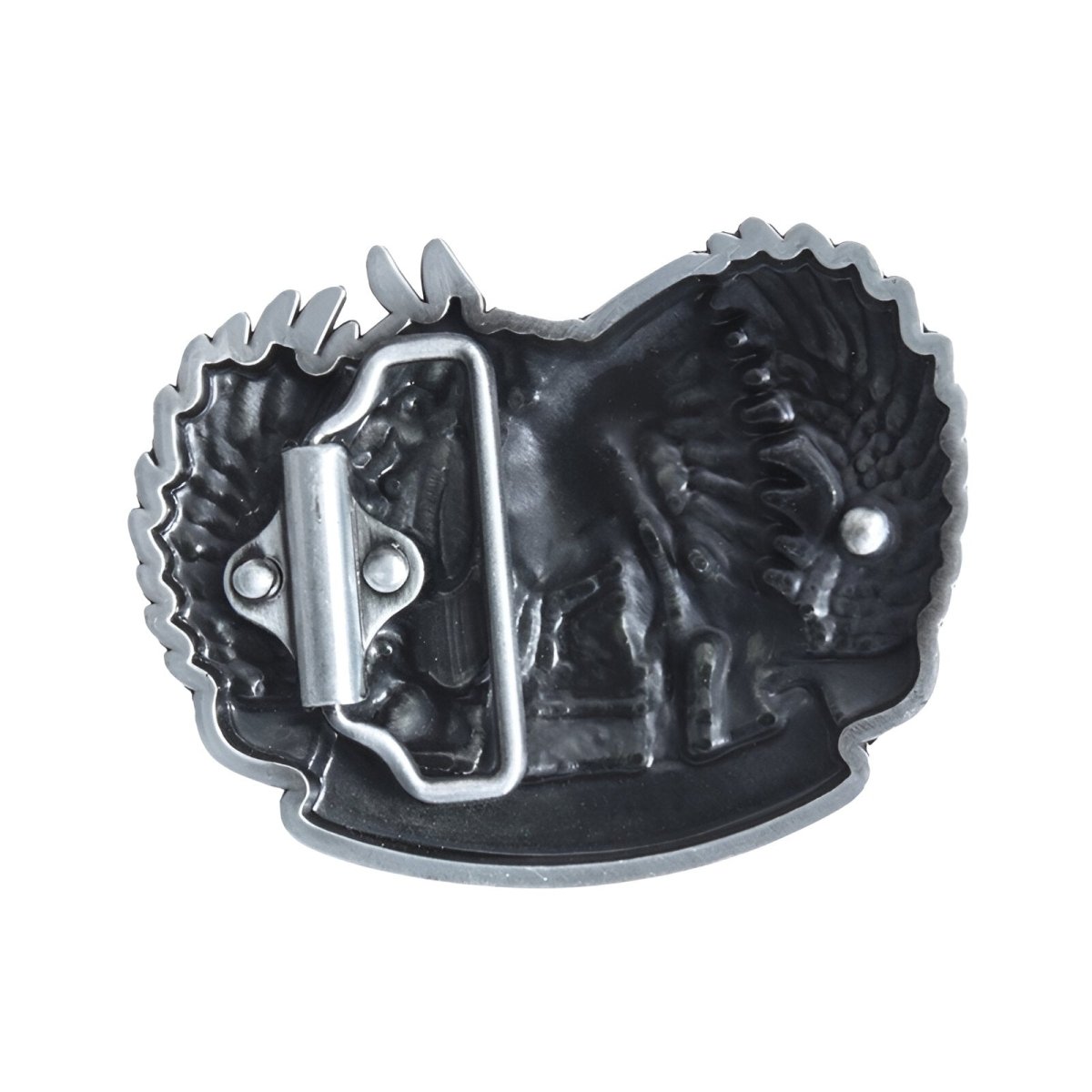This belt buckle celebrates the rich and profound history of Native American peoples, featuring an iconic representation of an Indian chief and his horse. The finely detailed headdress, highlighted with color accents, embodies pride and wisdom. The majestic presence of the horse alongside him symbolizes the sacred connection to nature and ancient equestrian traditions.