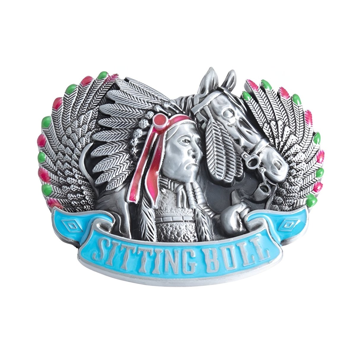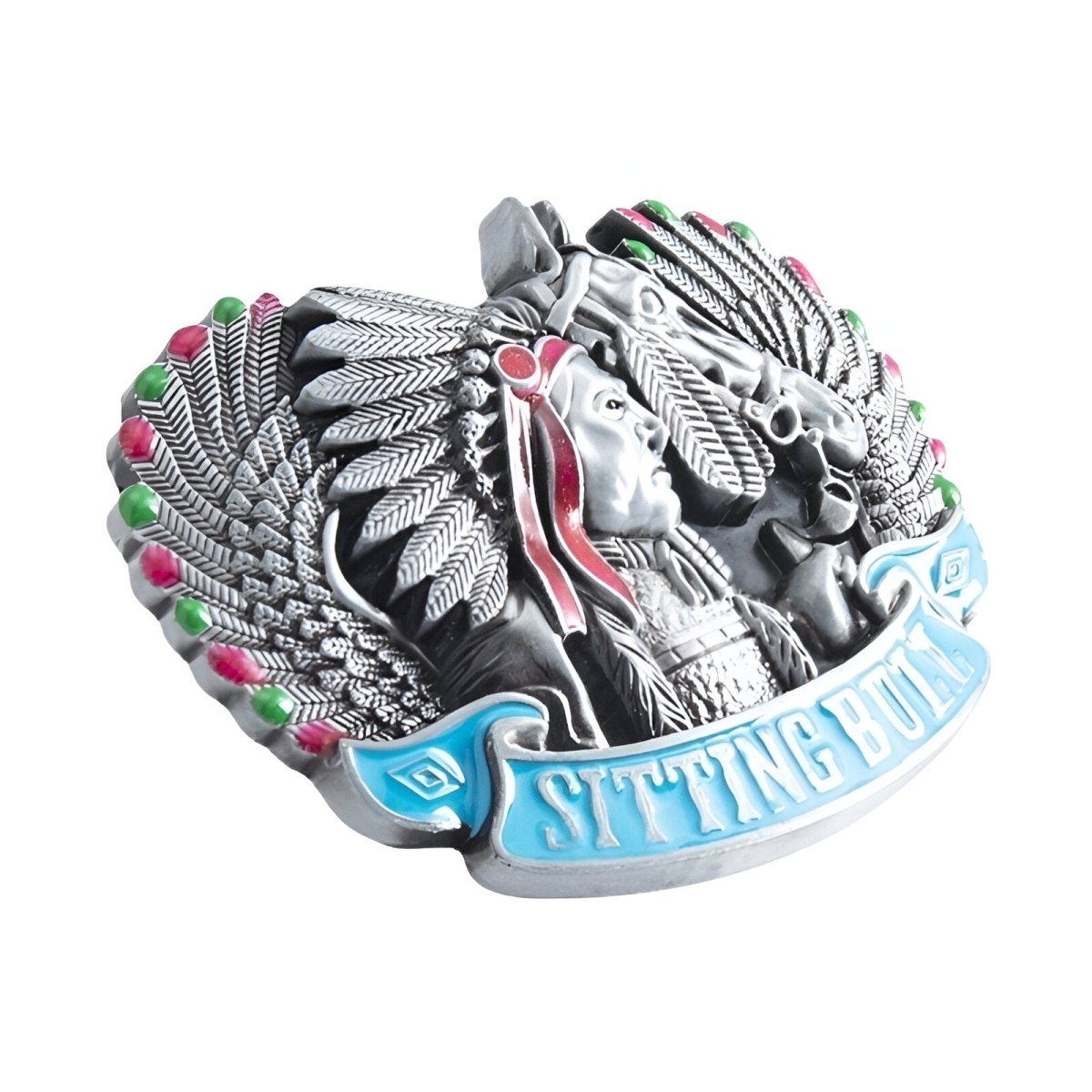 Wearing this buckle is like displaying a piece of American history, a celebration of the culture and spirit of Native American resilience. The blend of metal and vibrant colours creates an aesthetic that catches the eye, while the inscription highlights respect and remembrance for a great leader. This buckle is a statement accessory for those who value the richness of indigenous cultures and the legacy of the Wild West.
