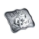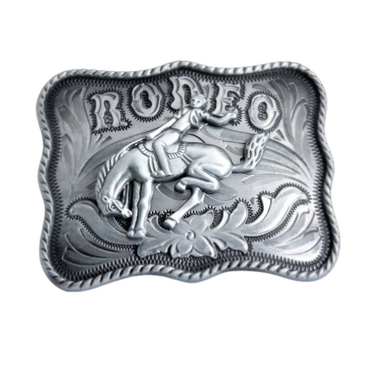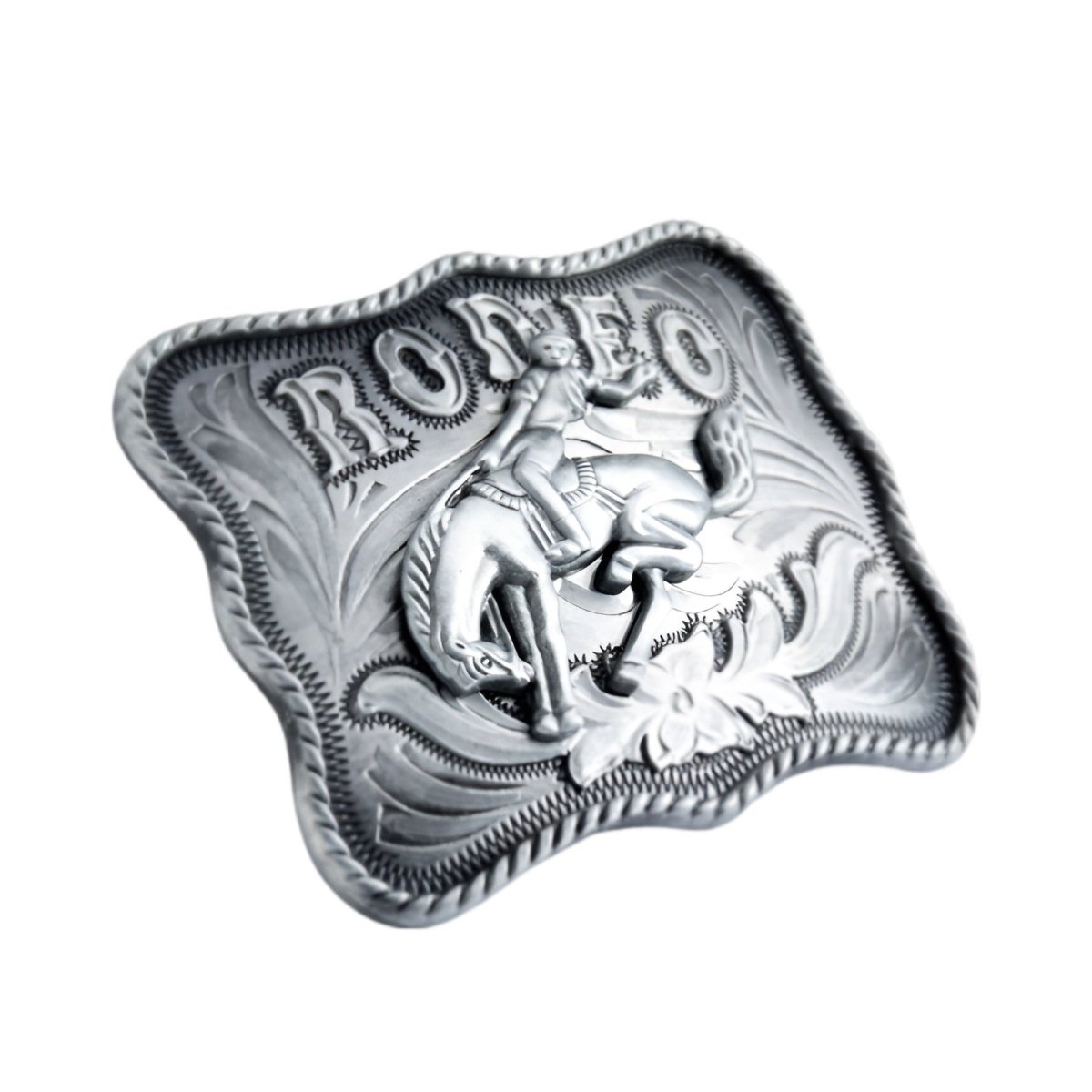 Inspired by the thrill and fervor of the rodeo, this belt buckle is a masterful celebration of this exhilarating sport. Enhanced by the sheen of aged silver, it features a rider boldly mastering his horse, embodying the classic struggle between man and beast. The letters "RODEO", carved with a commanding presence, dominate the scene, surrounded by a myriad of floral patterns and western symbols that pay tribute to the deep-rooted rodeo heritage in American culture.