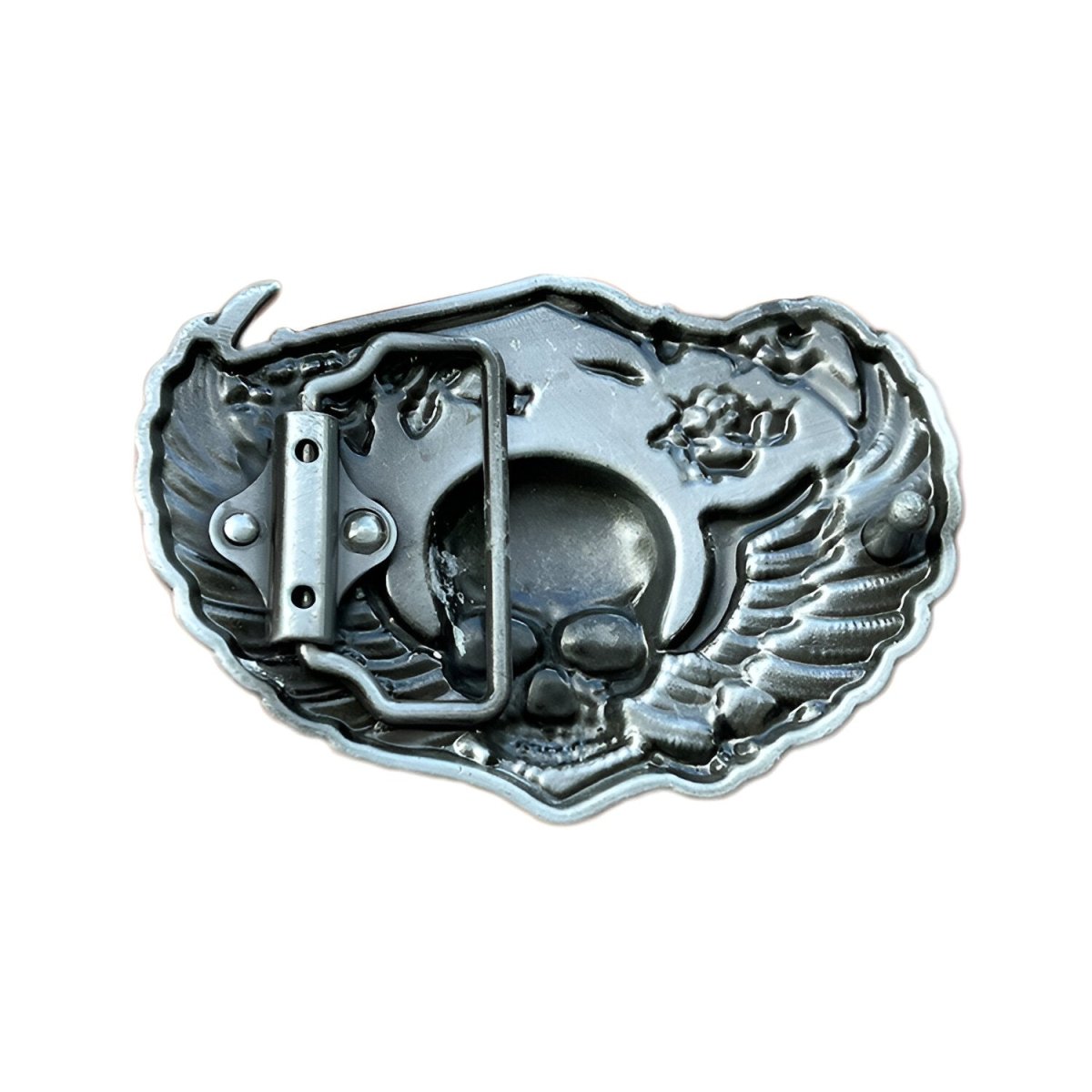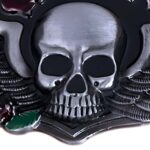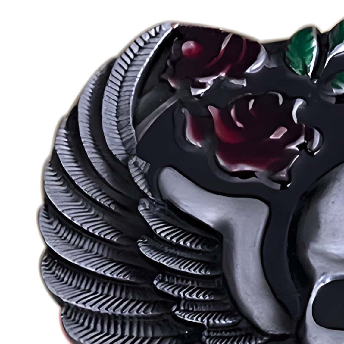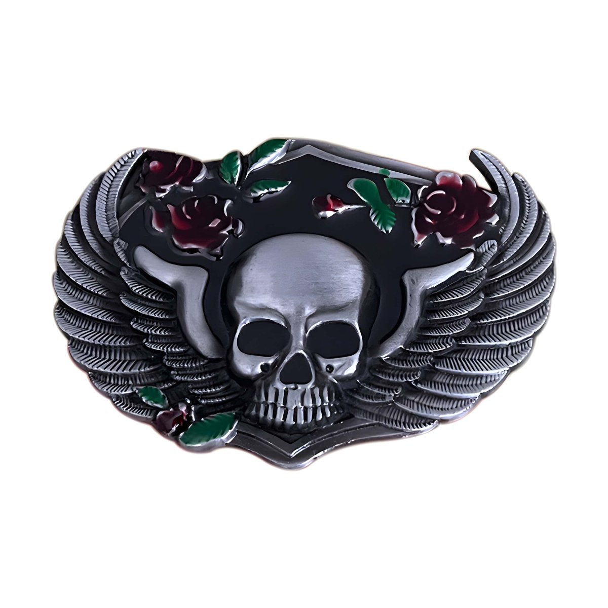 Evoking the dark beauty of a secret garden at midnight, this skull belt buckle features an imposing skull, crowned with grand wings and adorned with fully bloomed roses, celebrating the fusion of gothic style and romantic passion. The intricately crafted flowers add a splash of colour and life, creating an accessory that captures the essence of bold elegance and mystery.