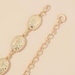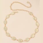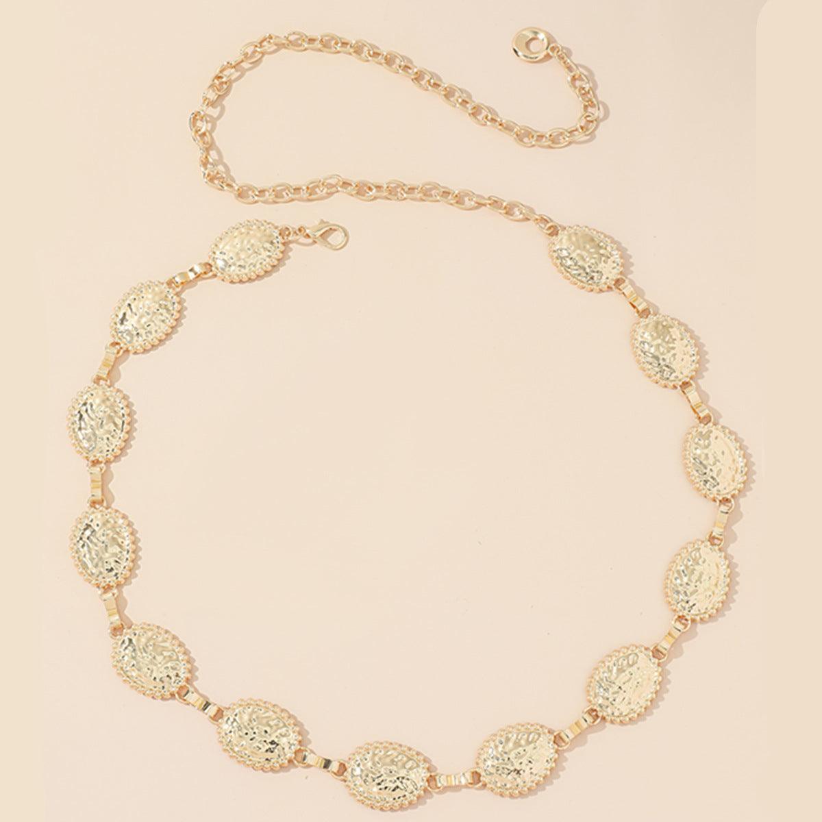 Discover the Coudathoe chain belt, where each oval link shines with textured details to captivate the eye. Far from ordinary, this accessory is a true adornment that gracefully encircles your waist, enhancing your silhouette and transforming outfits. The delicacy of its metallic pieces, paired with a golden warmth, makes it a favoured choice for lovers of fine details.