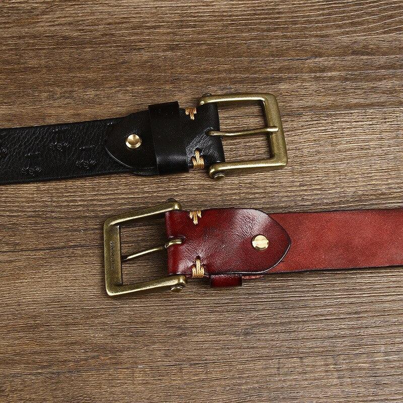 Immerse yourself in the world of refined elegance with this full-grain leather belt, designed for lovers of exceptional pieces. Its appearance is enhanced by a solid brass buckle with a golden finish, reflecting a discreet yet assertive luxury. The strap's texture, meticulously embossed with subtle patterns, adds a touch of sophistication to every movement. With an ideal width of 3.8 cm, it perfectly complements a carefully curated wardrobe, adding distinctive flair to your daily outfits or professional attire.