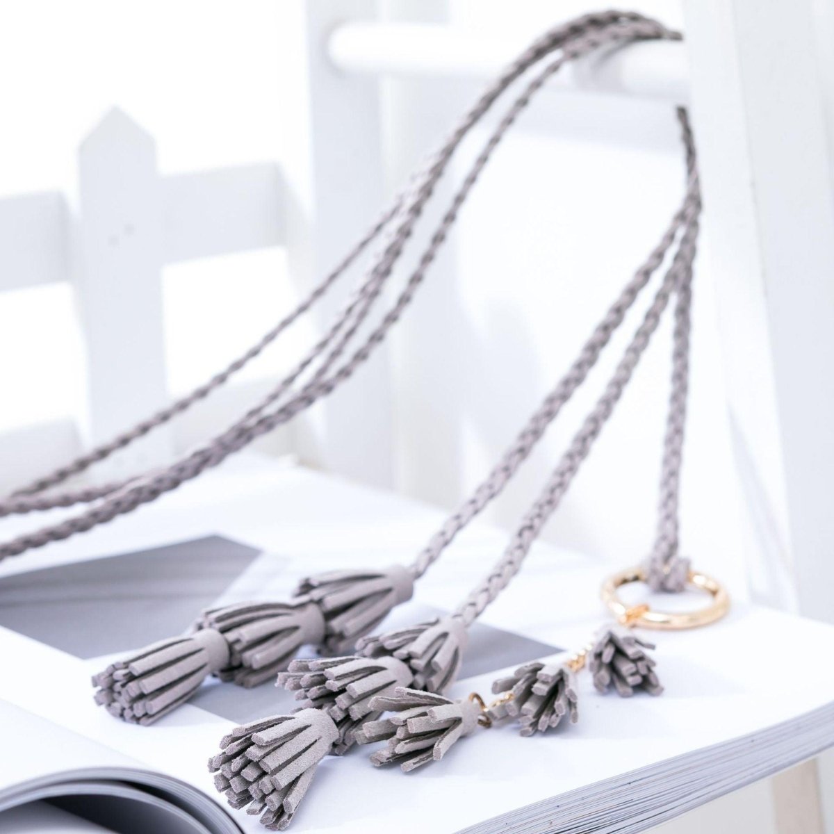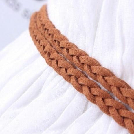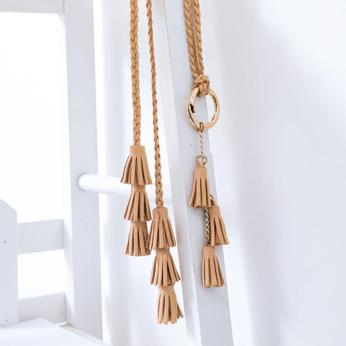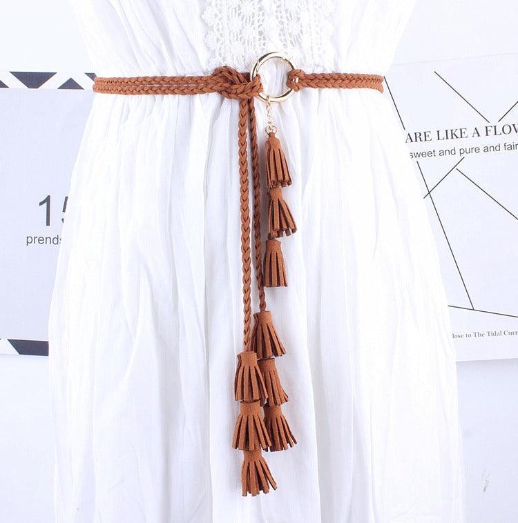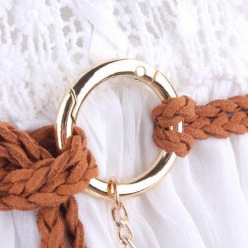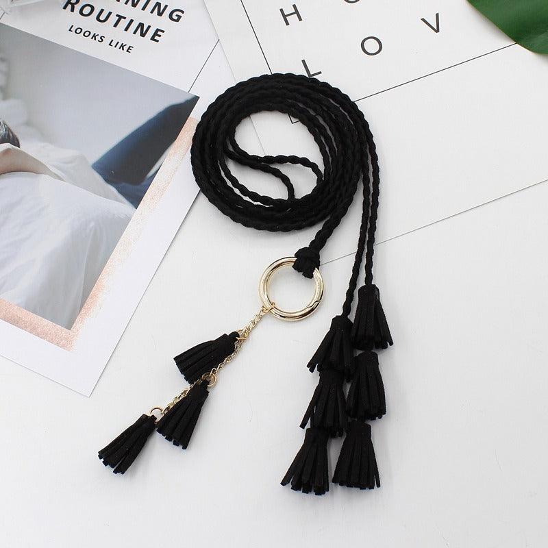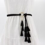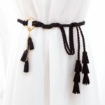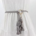 This belt stands out with its knotted buckle crafted from golden-hued metal alloy, adding a touch of understated elegance to its simplicity. The round shape and ease of knotting make the Clanti a perfect choice for those seeking both style and convenience. Delicate suede leather tassels add a whimsical and unique flourish, ideal for a boho-chic look. By choosing the Clanti wrap belt, you are selecting an accessory that brilliantly combines style, comfort, and elegance, ensuring you stand out with subtlety and refinement.